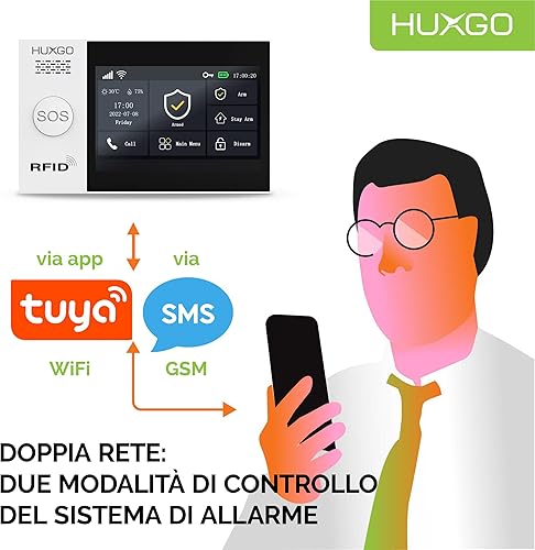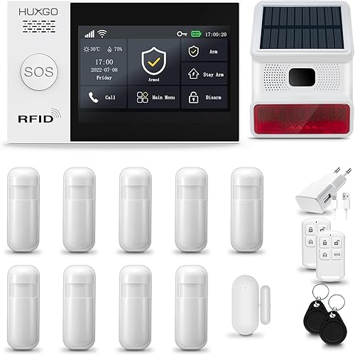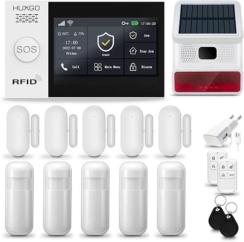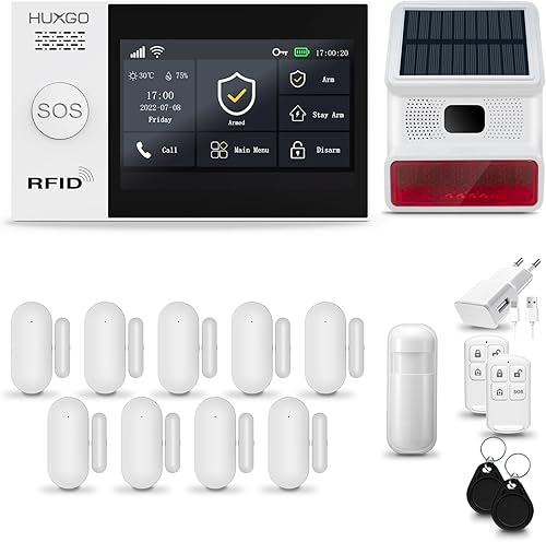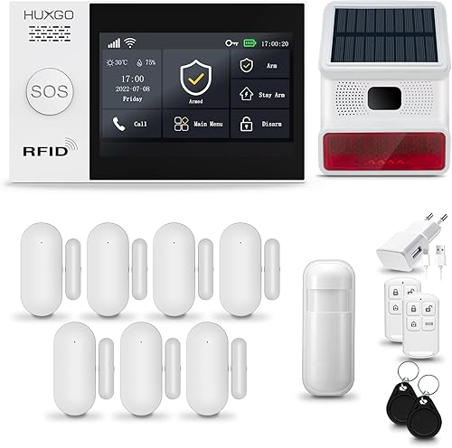 HUXGO® HXA007 Sistema di allarme casa senza fili con Radio Sirena solare WiFi + GSM 4G LTE | Impianto allarme casa kit con 1x sensori di allarme per finestre/portes, 3x rilevatori di movimento