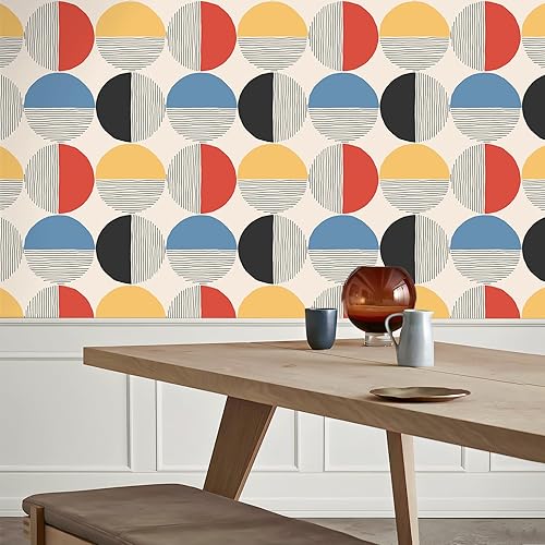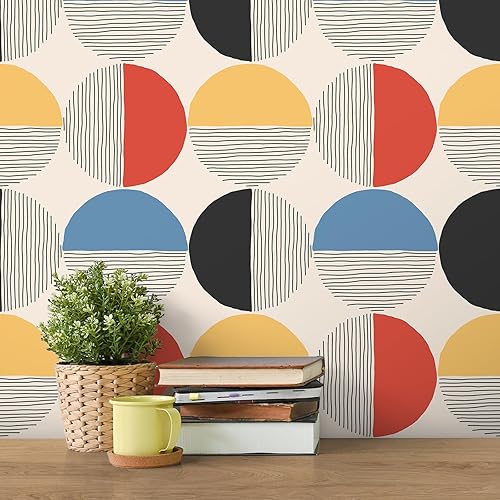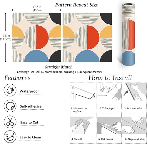 Carta da Parati Geometrica Boho Metà Secolo Pellicola Adesiva Geometrica Rotonda Astratto Pellicola Adesiva per Mobili Fantasia Carta da Parati Autoadesiva per Camera Letto Bagno 44,5cmx300cm