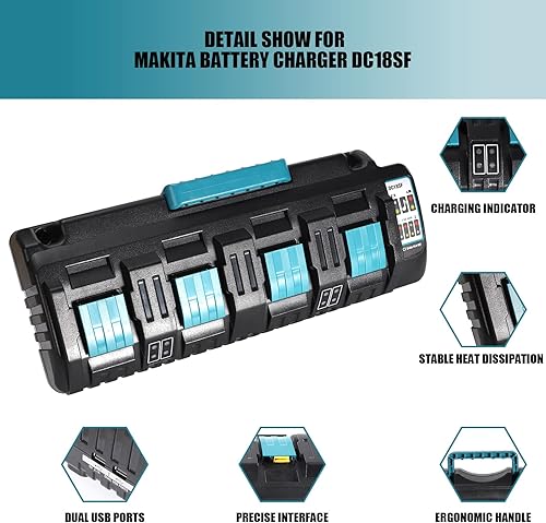 Caricatore a 4 porte DC18SF per Makita 14,4 V-18 V batterie al litio BL1850 BL1815N BL1830 BL1840 BL1850 BL1860 YEX-BUR 3A con 2 porte USB, sostituisce DC18RD DC18RE DC18RC