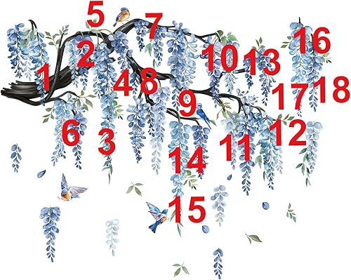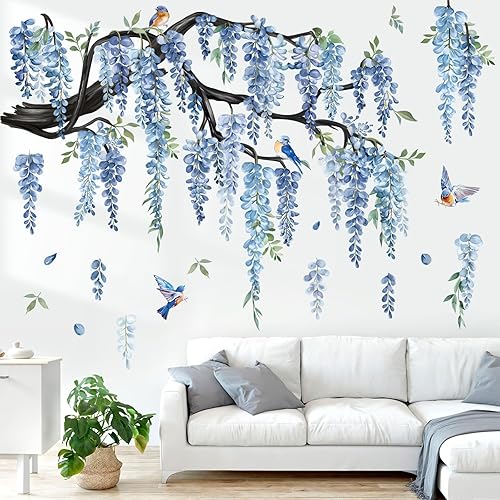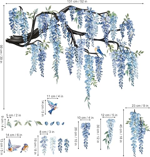 Adesivi Murali XXL Ramo di Albero Fiori Blu Adesivi da Parete Uccelli sul Ramo Fiori Foglie di Vite Acquerello Decorazione Murale Camerette Bambini Soggiorno Camere Ragazze