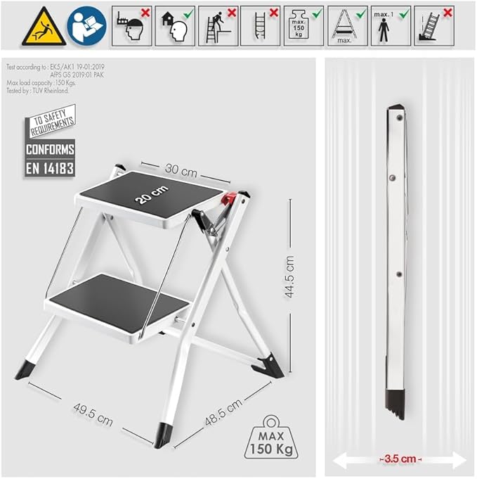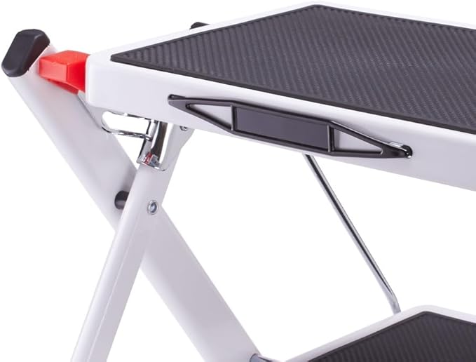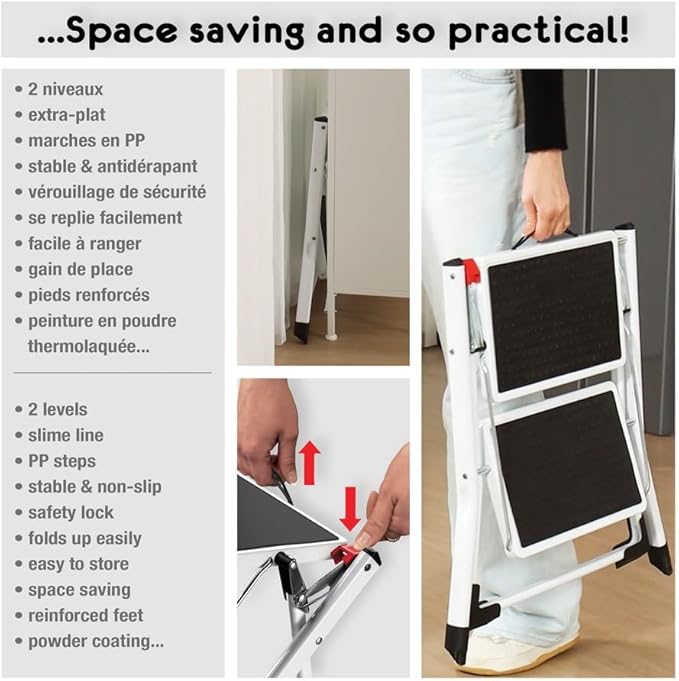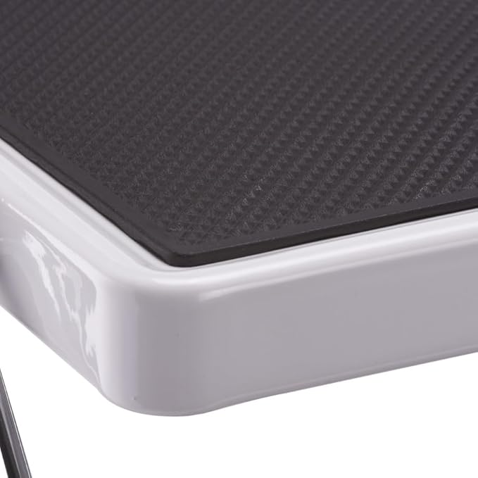 MSV, Sgabello a 2 gradini, Pieghevole, Sgabello leggero, Acciaio, Max 150 kg, Rivestimento antiscivolo dei gradini, Piedini in gomma, Compatto, 48x37x57 cm, Nero