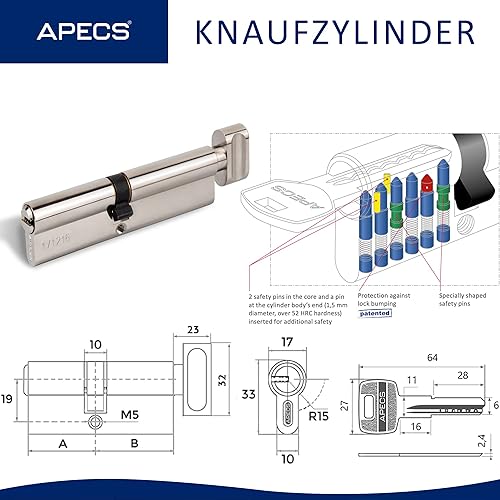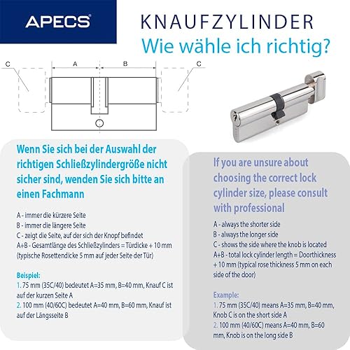 APECS Cilindro per serratura della porta d'ingresso con 5 chiavi, Cilindro a pomolo, Argento, Moderno