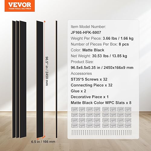 VEVOR Pannelli Acustici a Doghe in Legno, 8 Pezzi Pannelli Parete in Legno WPC con Accento per Pareti, Pannelli da Parete in Finto per Decorazioni e Ridurre Rumore, 2450 x 166 x 9 mm, Nero Opaco