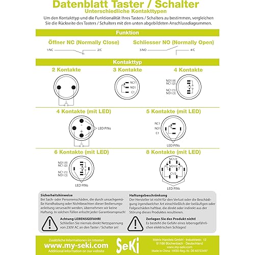 SeKi 19161 - Pulsante a pressione in acciaio inox, Ø 19 mm, a forma di testa curva, attacco a vite; campanello