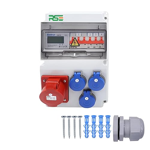 RSE Distributore di corrente da parete, completamente cablato, 4 circuiti, 128 A, 230 V, IP65, 210 x 122 x 210 mm, CEE Bals, Schuko, LS, RSE-001739