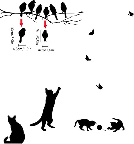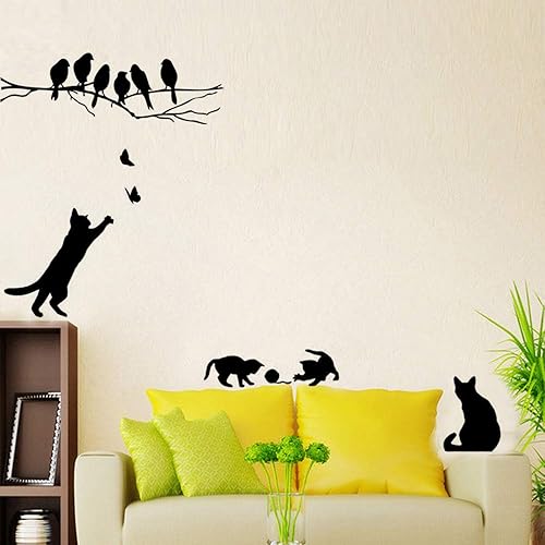 CUNYA 2 set adesivi murali neri carini, gatti che giocano e uccelli sui rami degli alberi Carta da parati murales Decorazioni per la casa per camere da letto, Soggiorno, Finestra