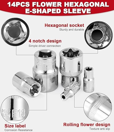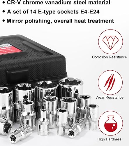 14 Pezzi Chiavi a Bussola E-Torx a Stella Set di Bussole Profilo Di Bussole a Stella E-TORX 1/4' 3/8' 1/2' E4 E5 E6 E7 E8 E10 E11 E12 E14 E16 E18 E20 E22 E24 con Custodia Nera