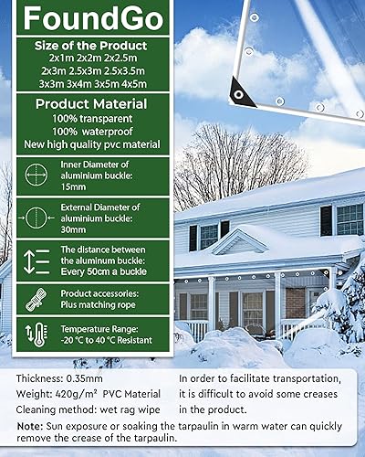 FoundGo 2.5x3m Telo Impermeabile Esterno Trasparente [420g/m² 0.35mm] Telone Trasparente per Esterni con Occhielli Impermeabile per Gazebo da Giardino con Corde e Fascette