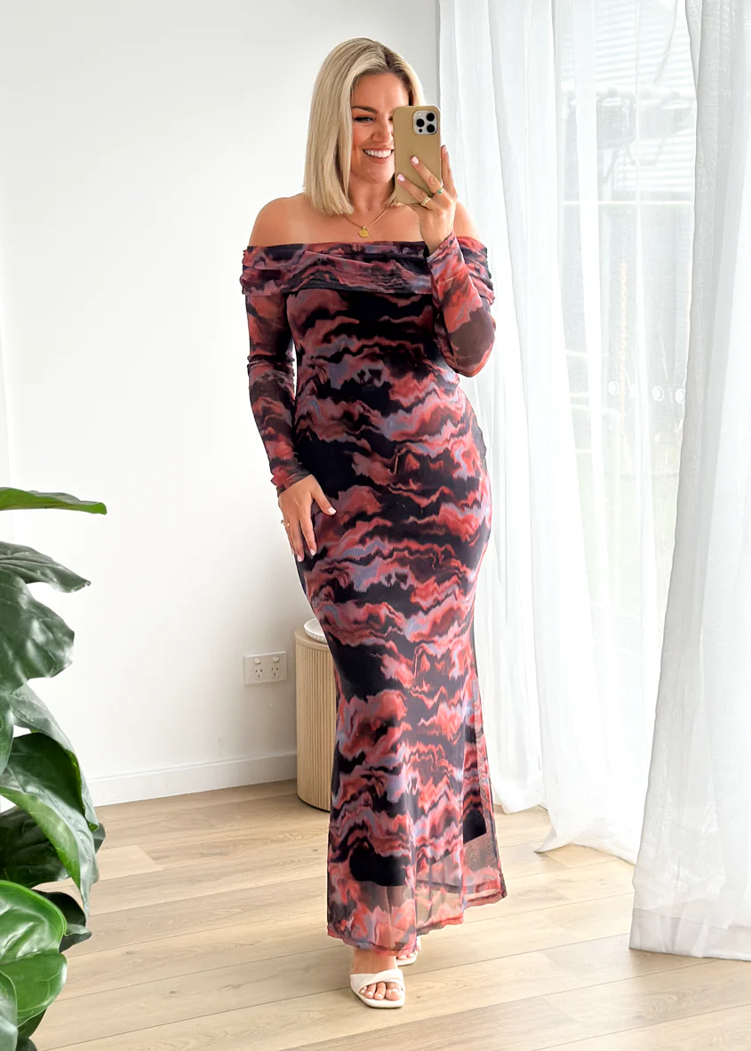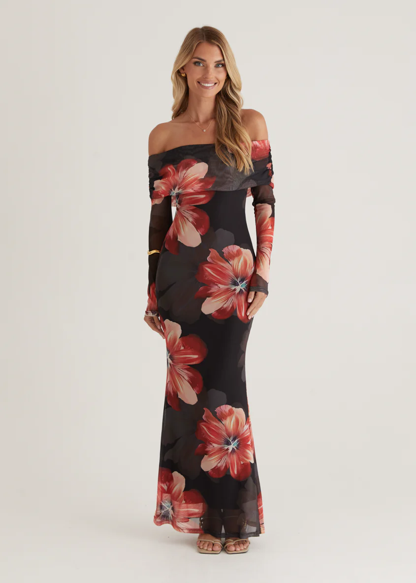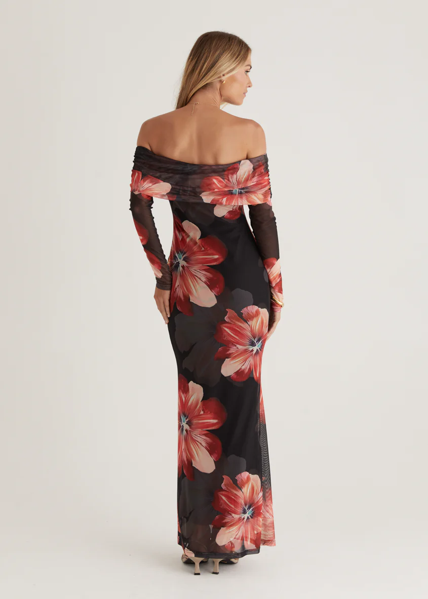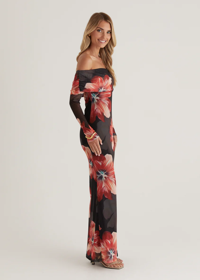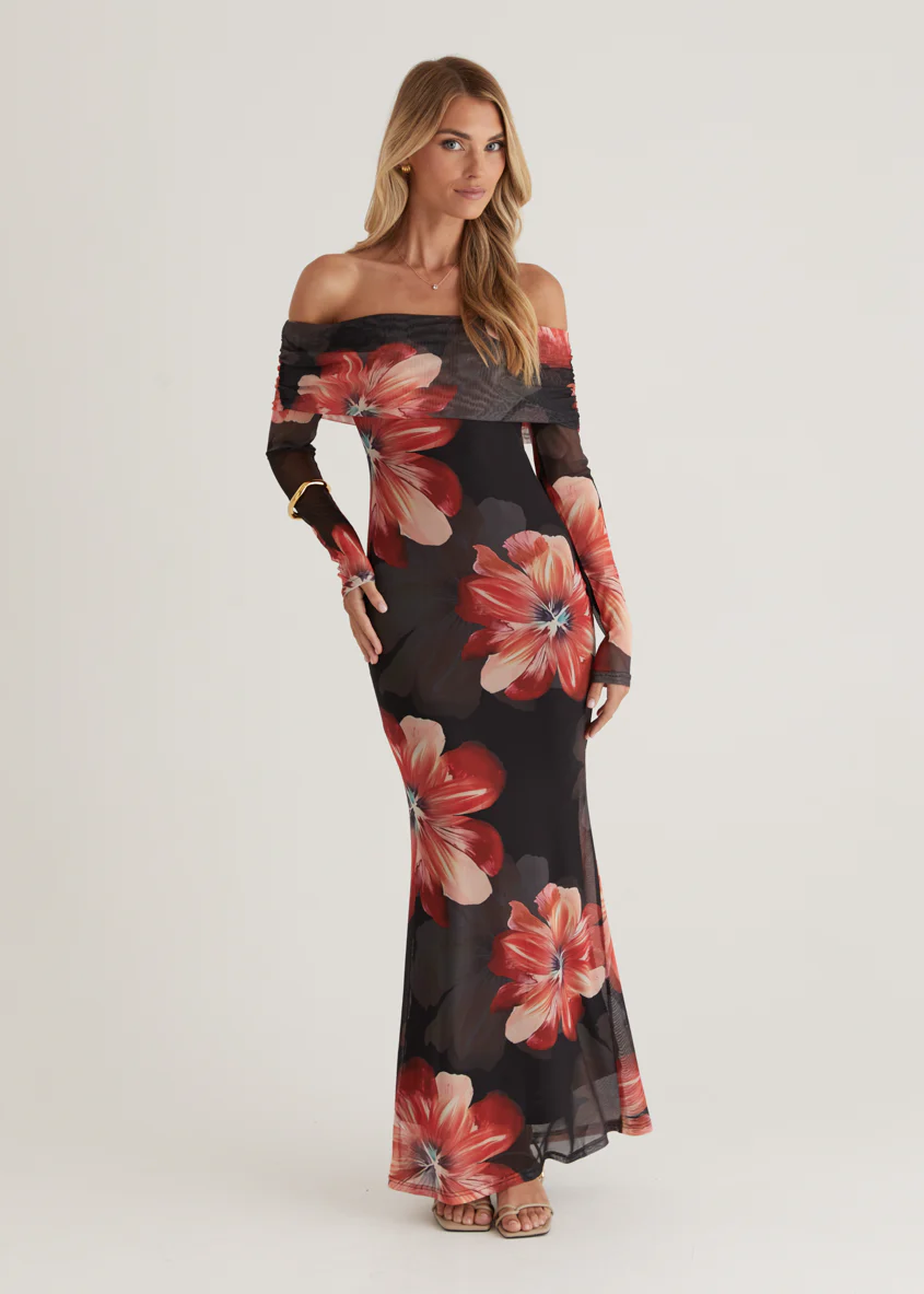 Sienna Mesh Off Shoulder Maxi Dress - Red Floral