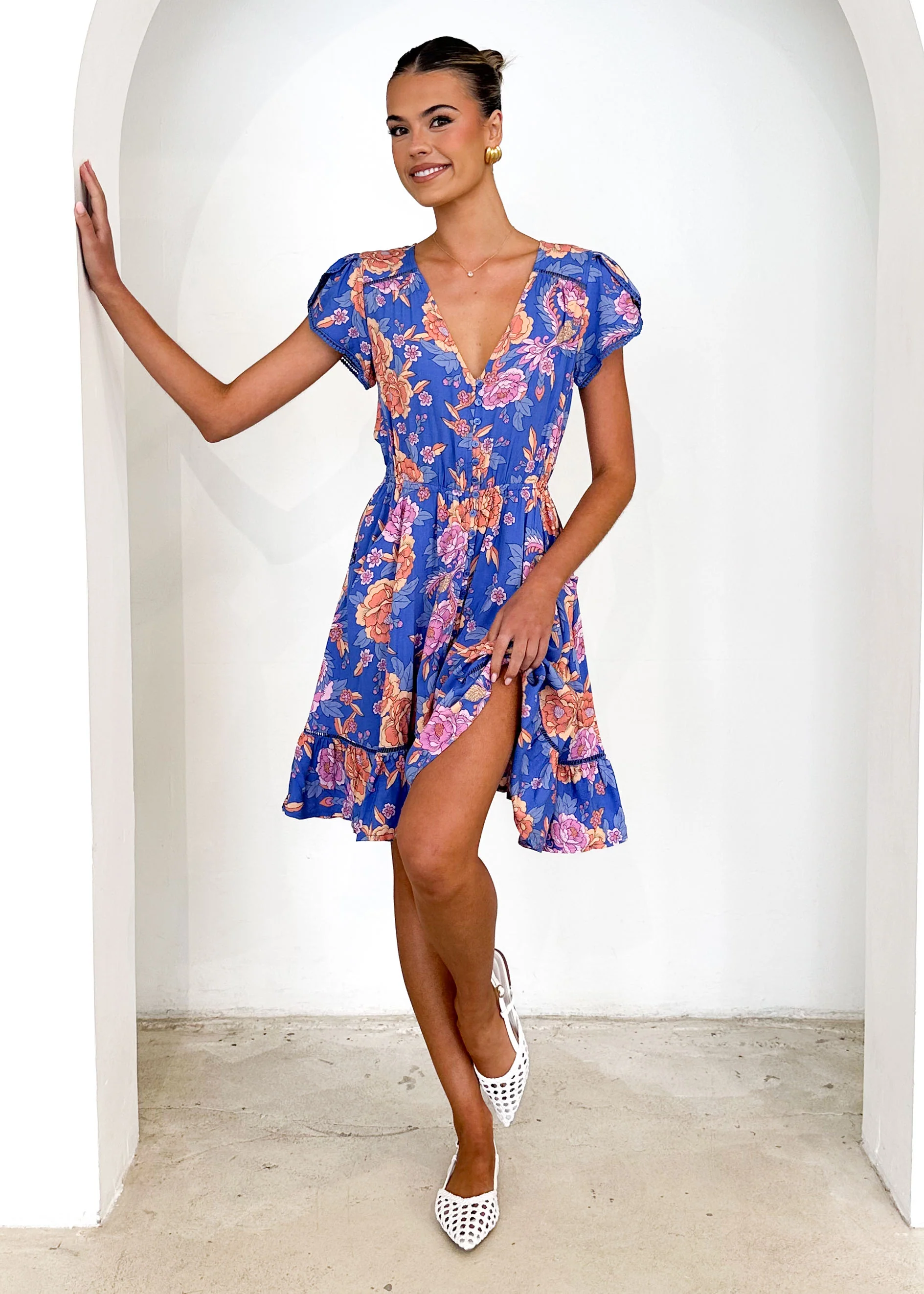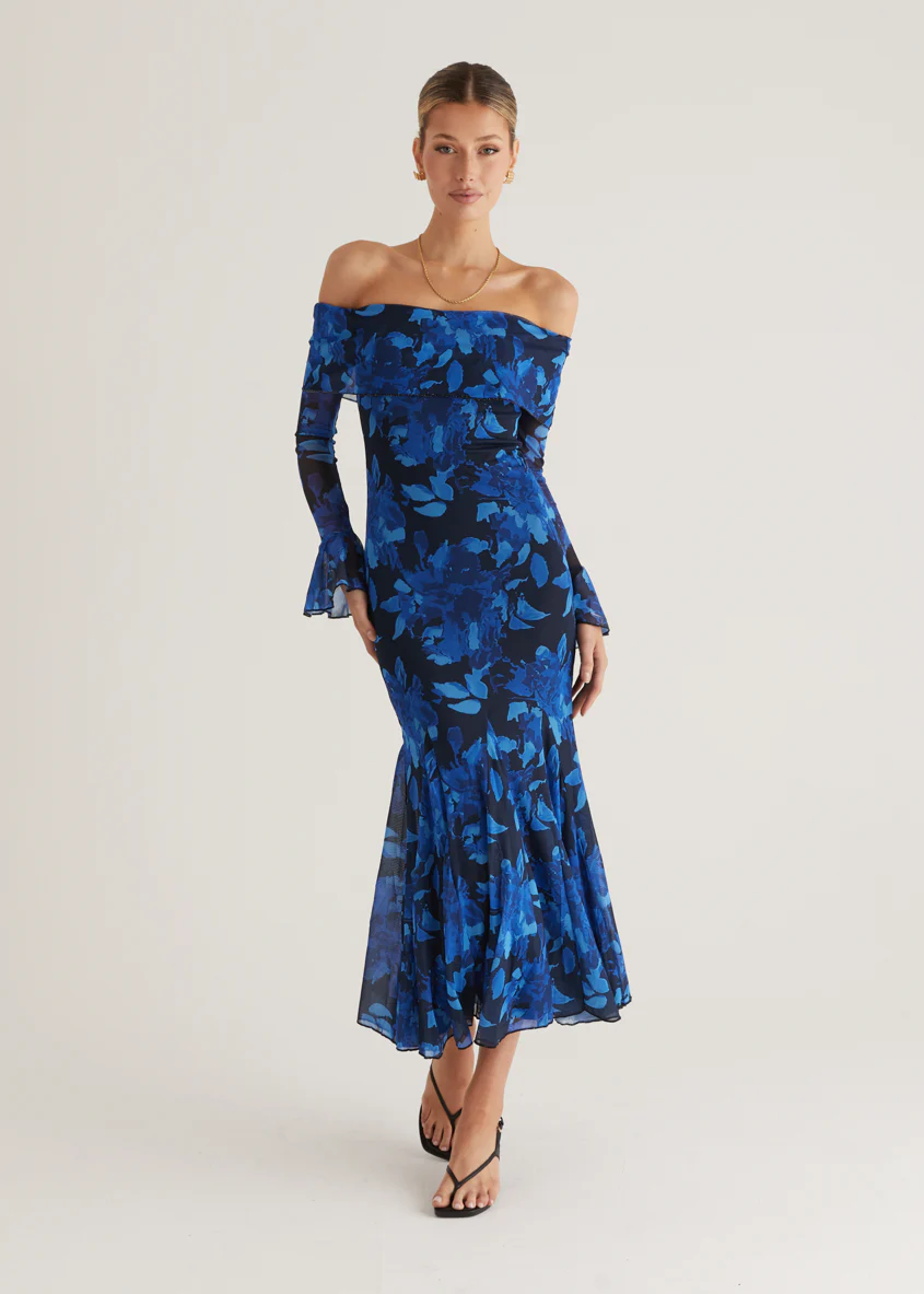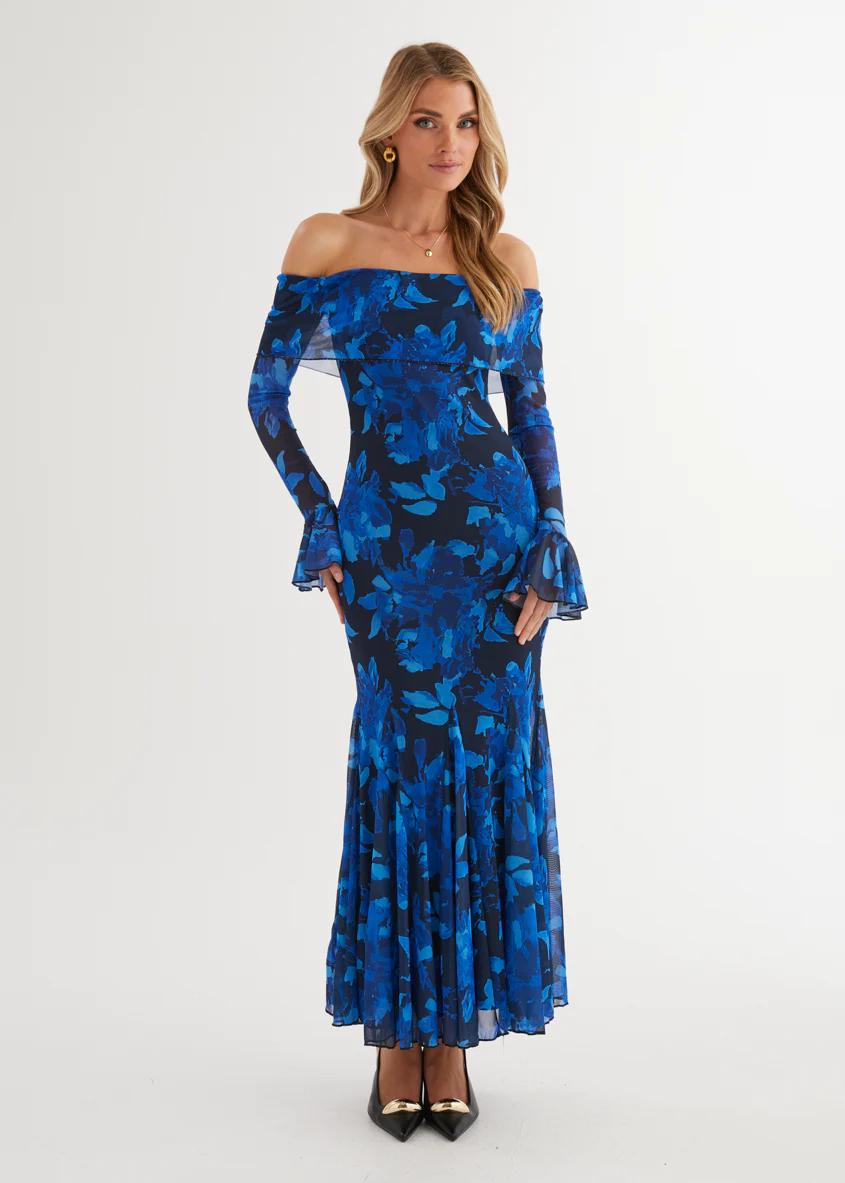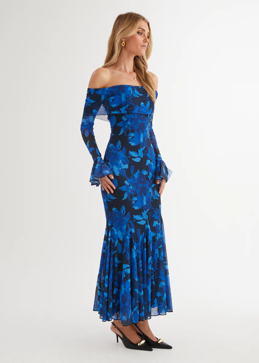 Linier Off Shoulder Mesh Maxi Dress - Blue Floral