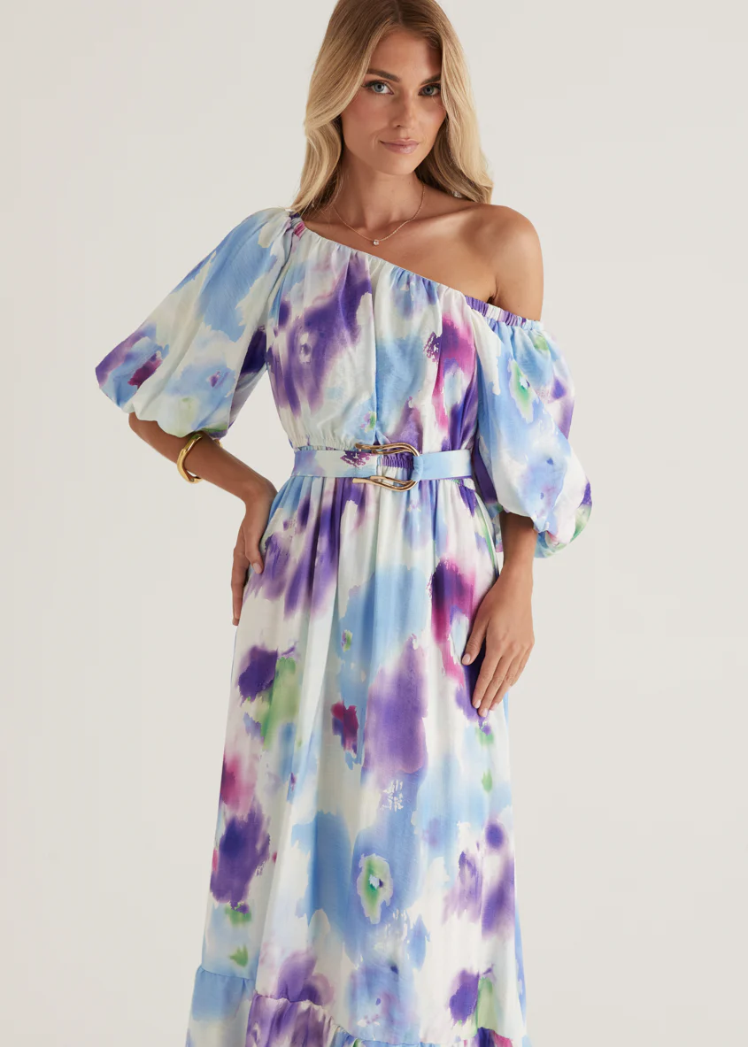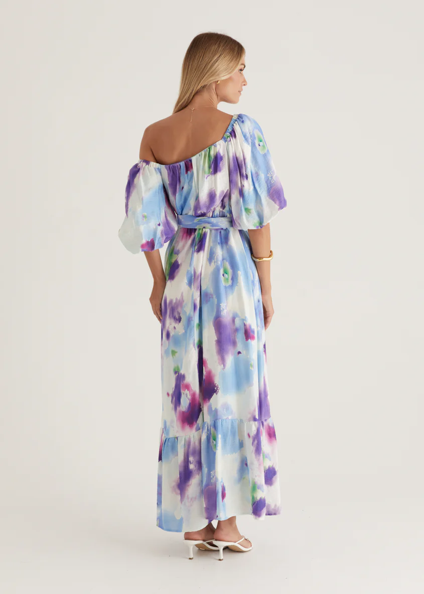 Halia Off Shoulder Midi Dress - Violet Watercolour