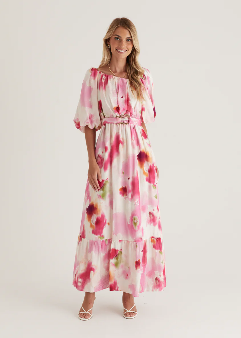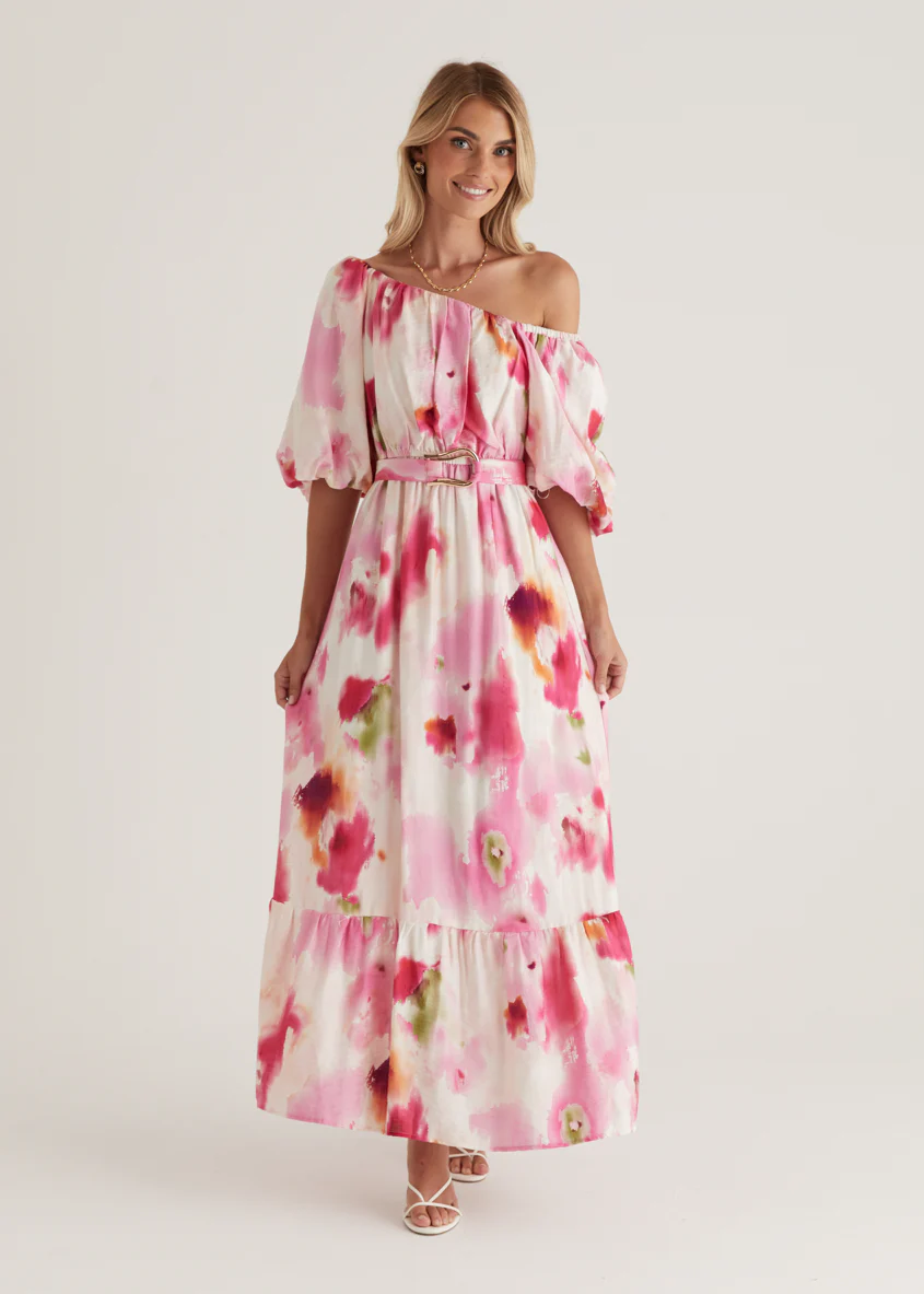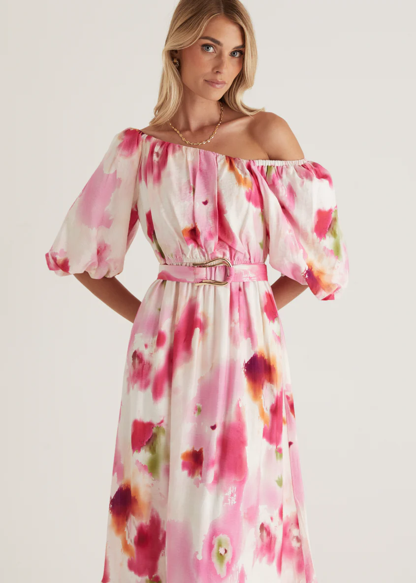 Halia Off Shoulder Midi Dress - Pink Watercolour