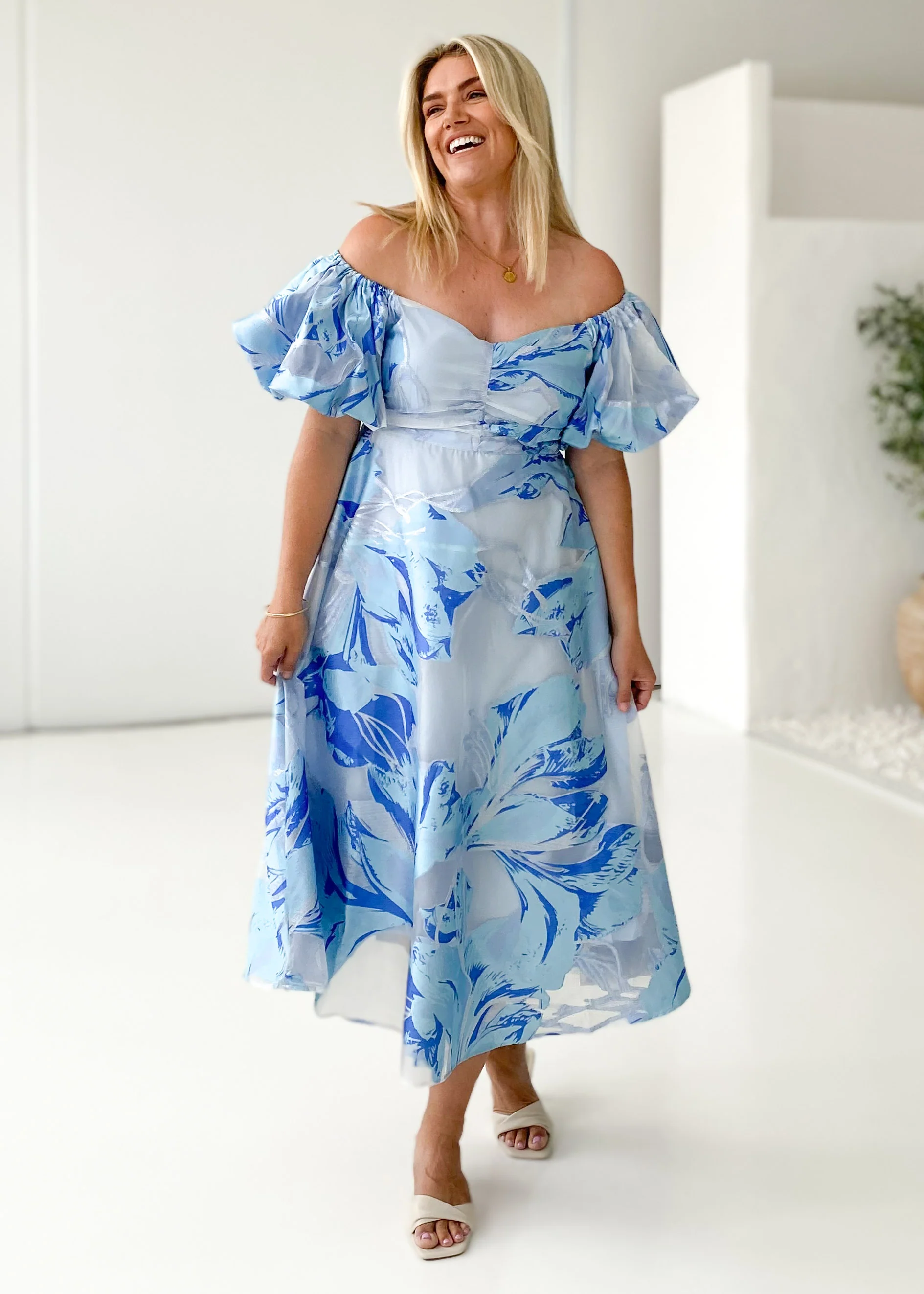 Anaya Off Shoulder Midi Dress - Sky Jacquard